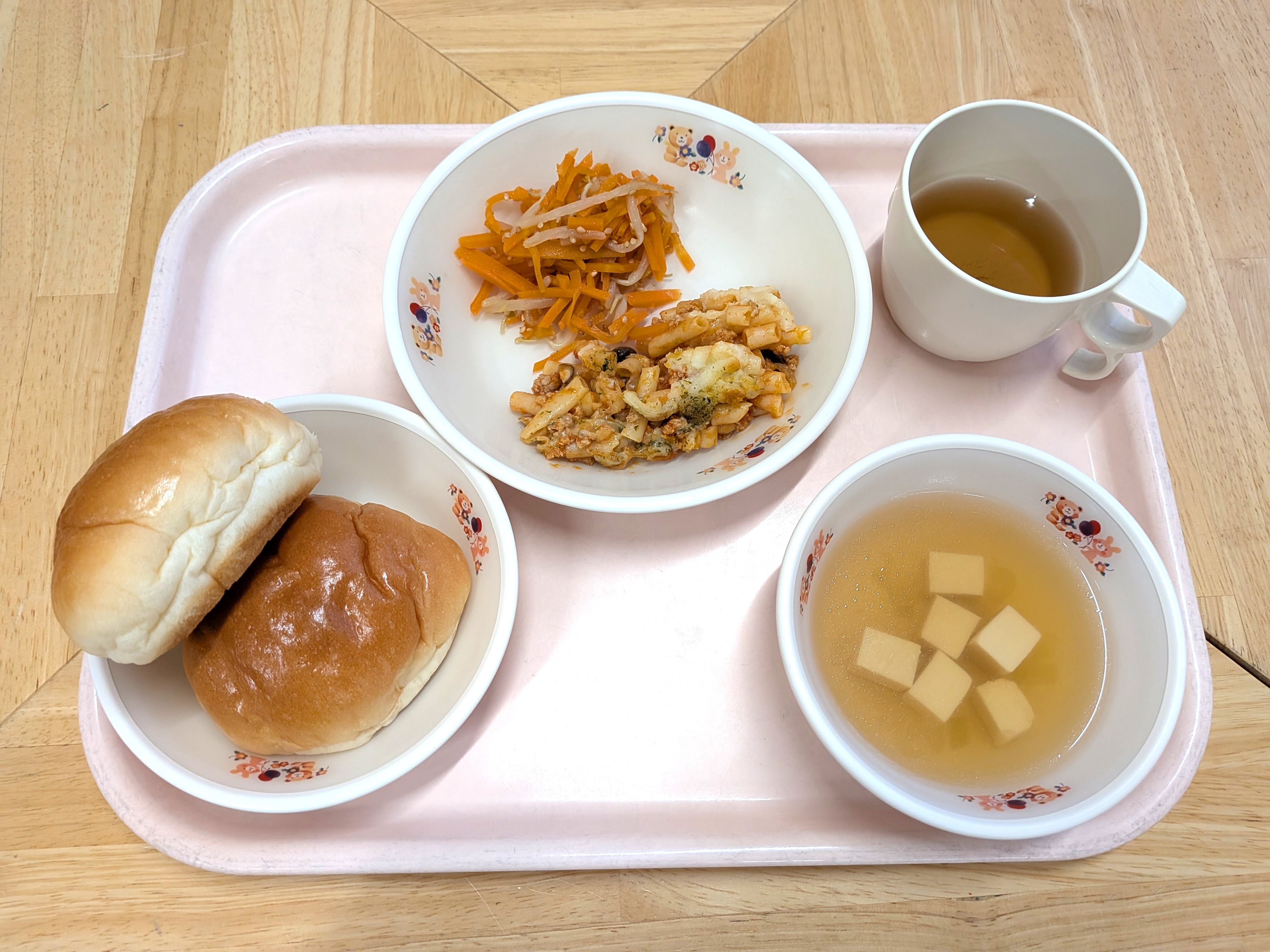 ロールパン・豚肉とマカロニのグラタン・にんじんサラダ・豆腐と長ねぎのスープ