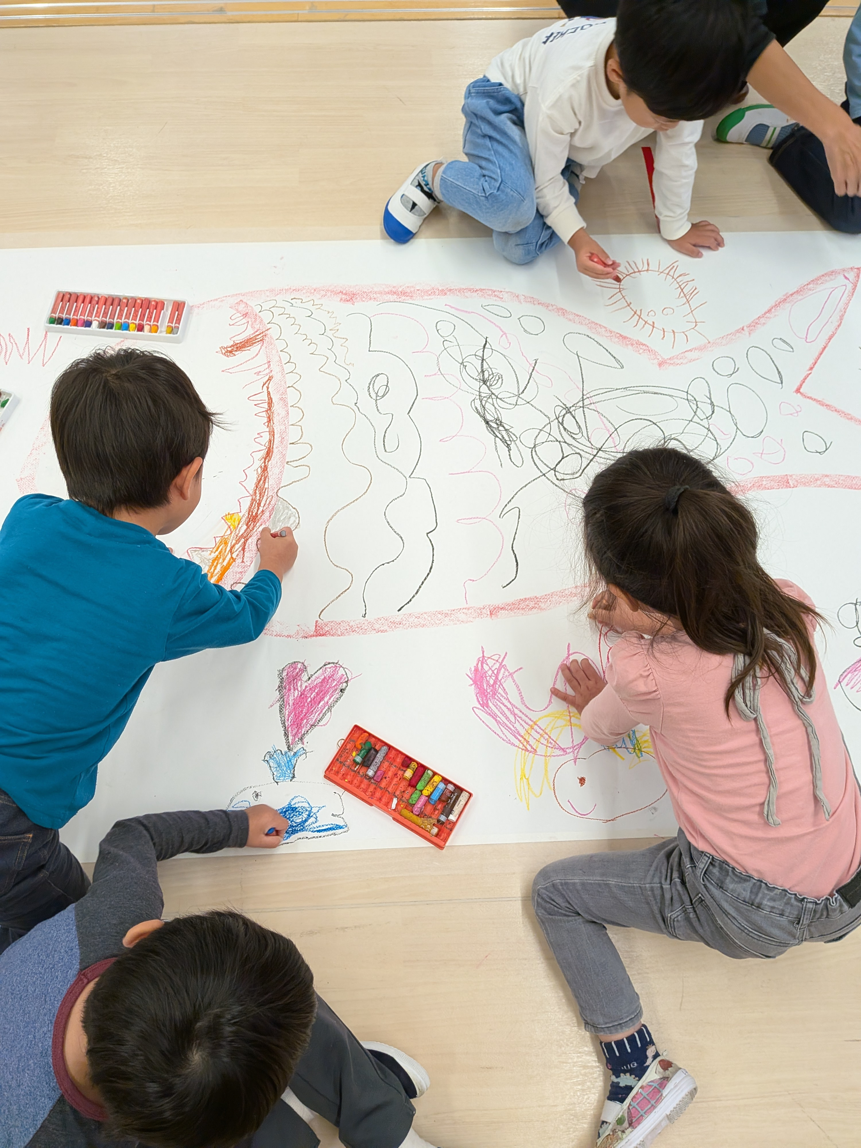 ひとりで黙々と描いたり、お友だちの絵と色が混ざるのを見て