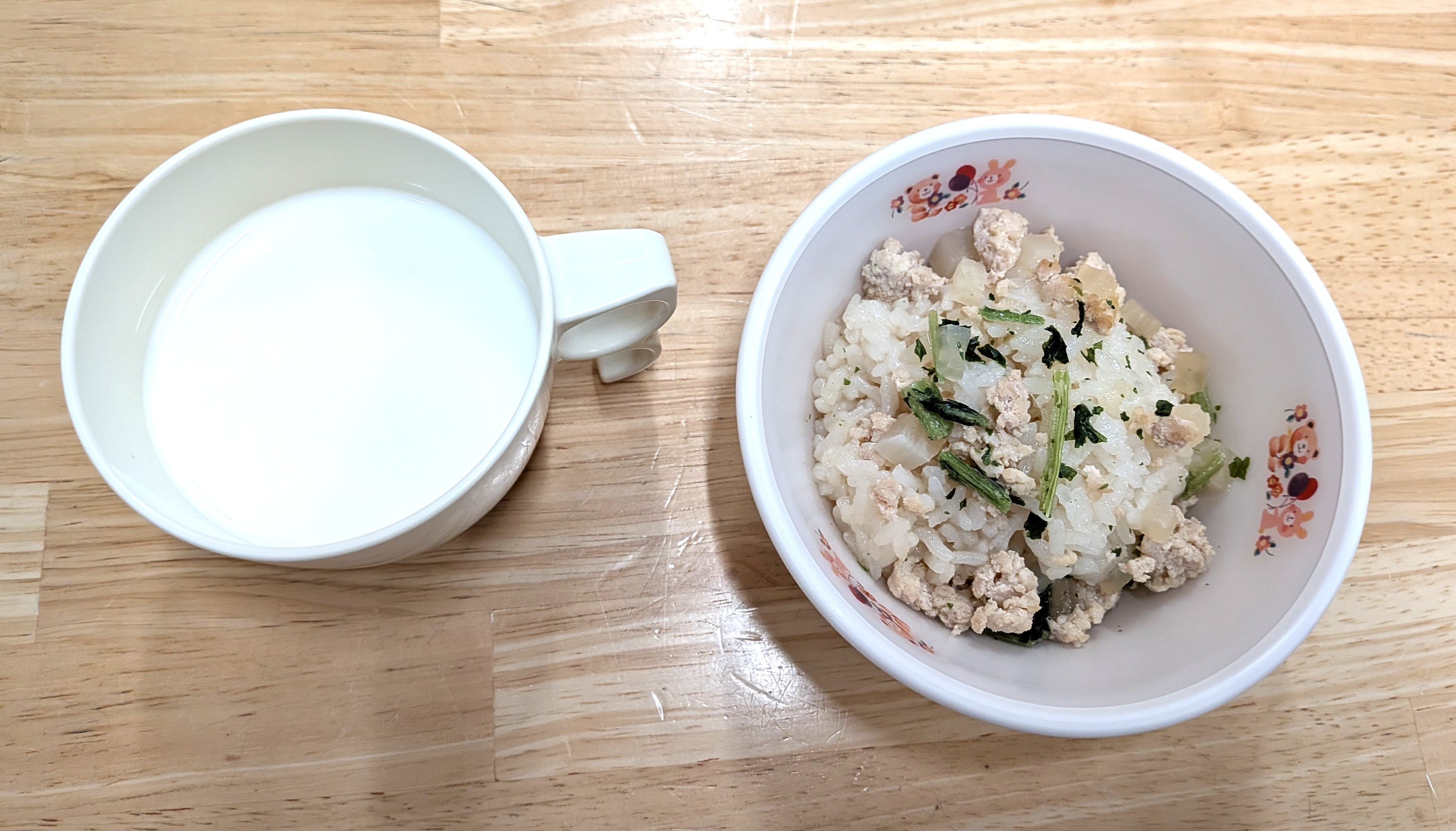 おやつには麦茶や牛乳を添えています。離乳食の小さなお友だちには、食事の様子を